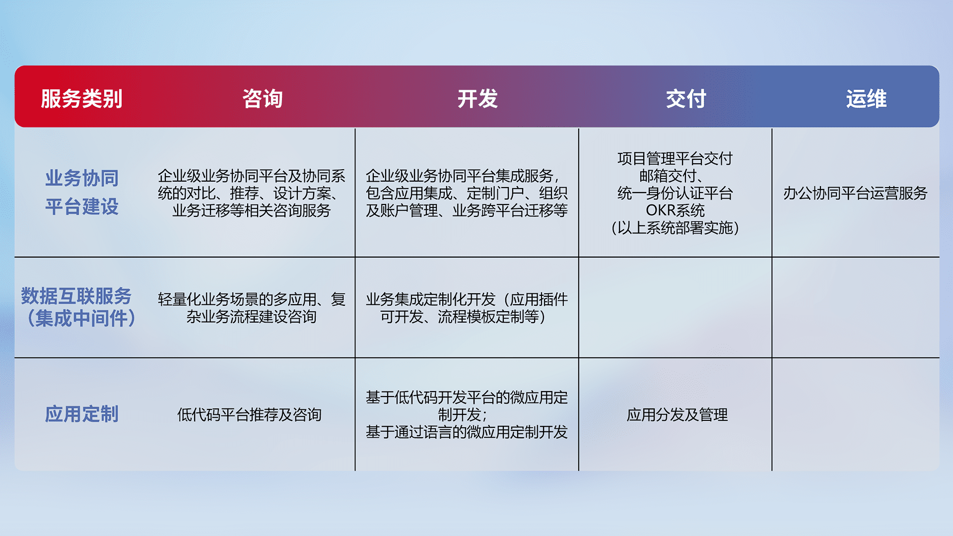 针对钉钉、、企微、、IDaas等平台级产品提供产品的规划、、方案、、、、交付、、、定制化开发等服务,,实现如统一协同办公、、、、智能客户服务、、、混合会议管理、、智能数据查询、、等业务场景,,,实现数字化转型。。。。